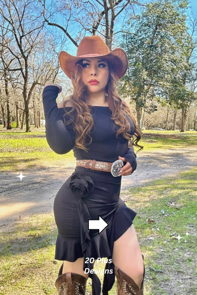 17. Off-Shoulder Black Dress with Ruffled Hem and Western Hat