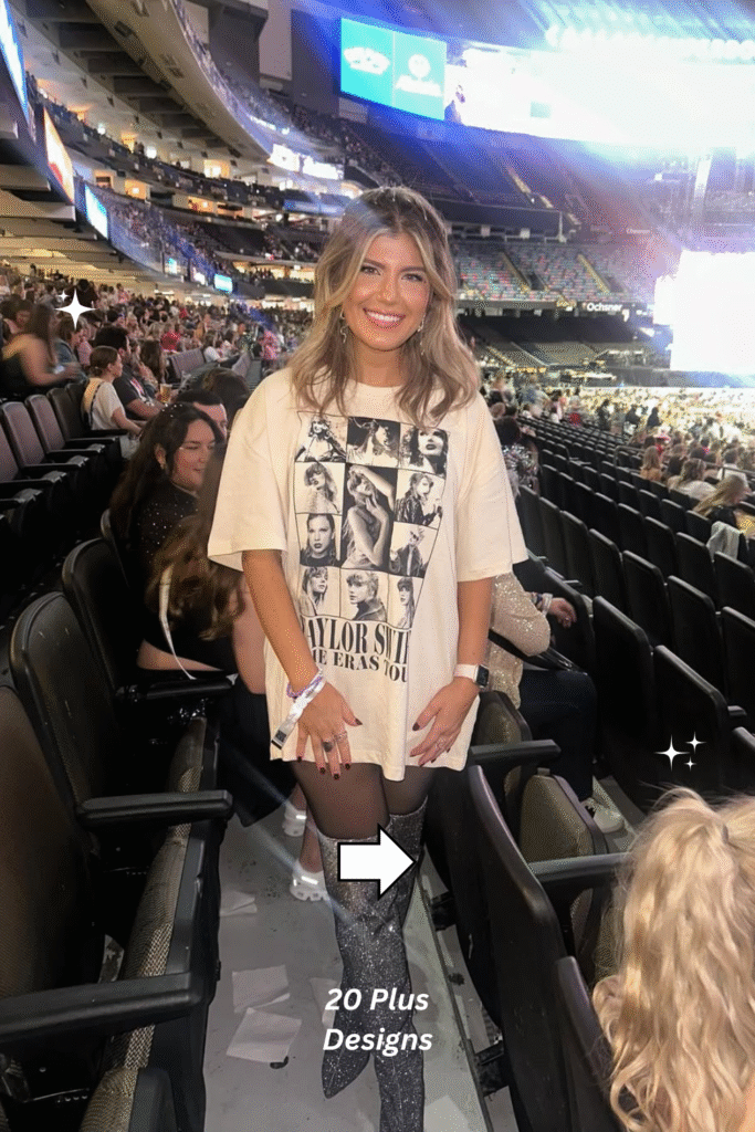 This playful combo of an oversized graphic tee and glitter thigh-high boots channels youthful energy and fun. The relaxed tee ensures comfort and breathability, while sparkling boots add glam and attitude. Ideal for casual, high-energy concerts, this look keeps fans stylish, confident, and ready to sing along with every track.