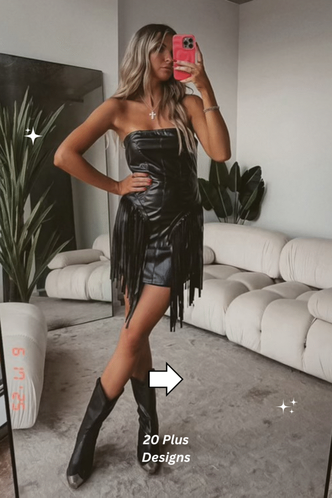 A black fringe leather mini dress brings classic rock-and-roll vibes to your concert look. The fringe adds movement and energy, while the leather exudes edgy sophistication. Perfect for dancing, jumping, and enjoying the night, this ensemble balances comfort with trend-driven style, making it a statement outfit for any Sabrina Carpenter fan.