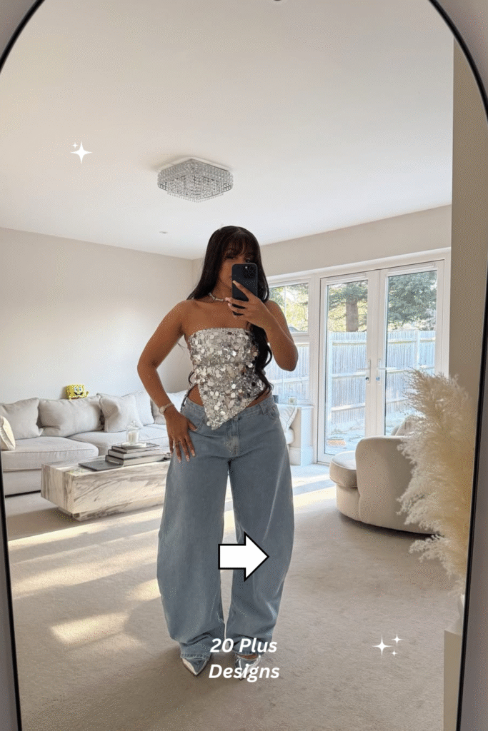 5. Silver Sequin Corset with Relaxed Denim Trousers