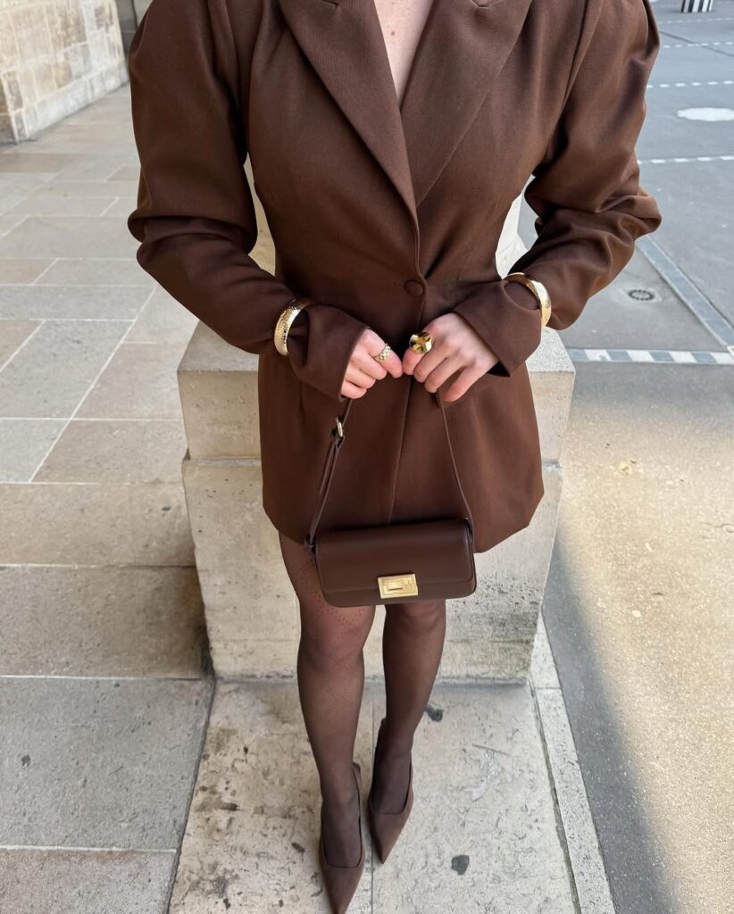 This outfit blends tailoring with playful detail, creating a street-chic ensemble perfect for nights out or fashion-forward events. The cocoa blazer dress brings sleek structure, while the sheer dot tights add a whimsical, feminine touch. Both elements work together to create a striking silhouette that feels polished yet edgy. The comfort of breathable tights and the relaxed fit of the blazer dress keep the look wearable throughout the day or evening.