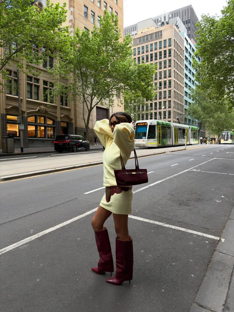 This outfit delivers a playful yet bold take on street style. The lemon knit mini introduces brightness and youthful charm, while the oxblood leather boots ground the look with depth and attitude. Perfect for sunny days out or social gatherings, the contrast between soft knit textures and rich leather tones creates a stylish visual balance. It’s a great example of how colorplay and texture mixing can breathe new life into simple silhouettes.