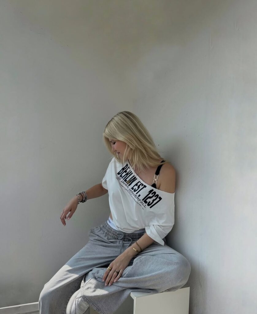 This ensemble blends laid-back lounge comfort with a splash of street-smart attitude. The off-shoulder graphic tee introduces a hint of femininity and edge, while the ash joggers keep the overall vibe relaxed and breathable. Perfect for café dates or travel days, it offers the ease of loungewear without sacrificing style. The subtle graphic elements and soft tones create a cohesive look that proves streetwear can be both comfortable and expressive.