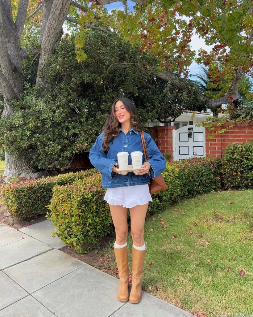 A denim overshirt adds rugged charm, while frilled cotton mini shorts bring softness and playful movement. This outfit is perfect for warmer days, beachside strolls, or laid-back meetups. The contrast between structured denim and airy bottoms creates a fresh silhouette that feels both youthful and street-style ready. It balances comfort, breathability, and modern flair effortlessly.
