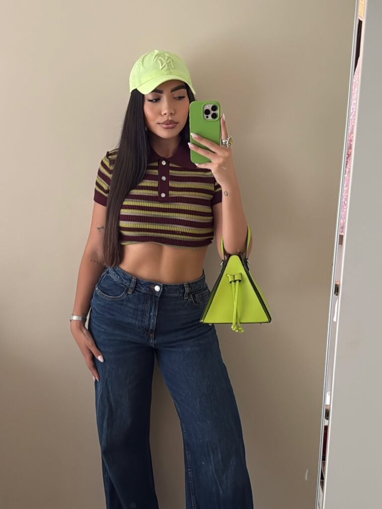 A striped polo crop paired with wide-leg denim offers a nostalgic yet trend-forward vibe. The polo adds a sporty element, while the indigo denim provides classic structure with a relaxed twist. This outfit works beautifully for casual weekdays, campus life, or shopping days. The cropped silhouette paired with wide legs creates a flattering proportion that feels fresh, youthful, and perfectly aligned with today’s streetwear sensibilities.