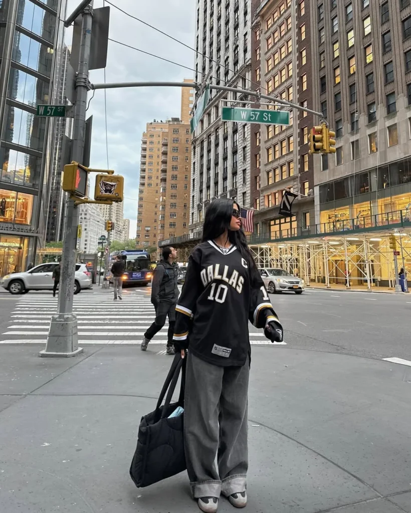 This look embodies classic streetwear energy with its oversized varsity jersey, lending a relaxed, sporty feel. Paired with charcoal wide-leg trousers, the outfit becomes more refined and fashion-forward. Perfect for campus life, casual outings, or weekend events, it strikes a balance between comfort and trendiness. The blend of athletic inspiration and modern tailoring creates a bold yet wearable ensemble.