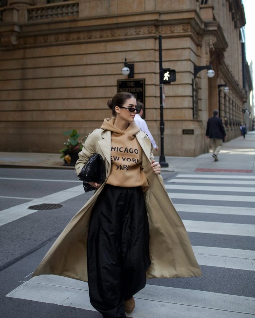 This outfit combines timeless outerwear with street-style energy, creating a look that’s both classic and contemporary. The beige trench coat adds a sleek, structured silhouette, while the urban graphic hoodie underneath introduces a burst of personality and color. This pairing is perfect for transitional weather and works effortlessly for city outings, coffee runs, or a casual evening stroll. The contrast between polished tailoring and relaxed hoodie comfort brings a sense of intentional balance, giving the outfit a fashionable yet approachable vibe that fits perfectly into the modern streetwear aesthetic.