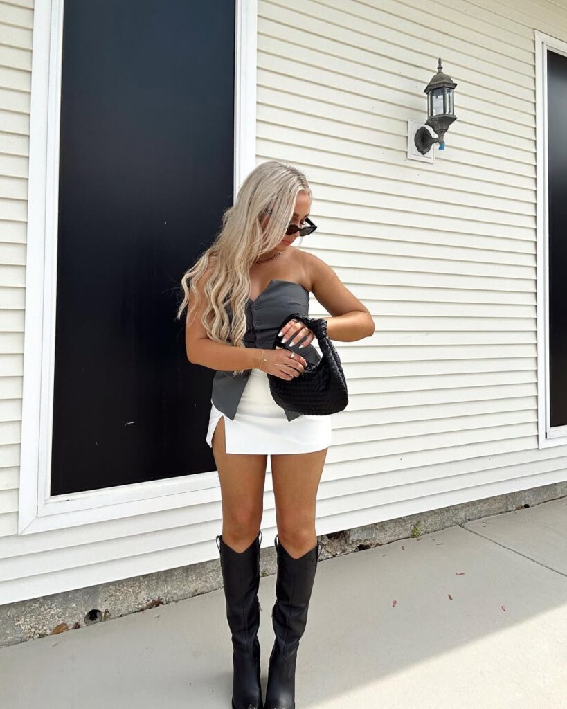 This pairing elevates streetwear with a refined, fashion-forward twist. The slate corset top adds structure and modern sophistication, contrasting beautifully against the softness of the ivory mini skirt. Together, they create a striking silhouette that works well for warm-weather outings, fashion events, or stylish brunch plans. The combination blends edgy construction with minimal elegance, making it one of the more elevated interpretations of streetwear while maintaining a youthful sense of ease.