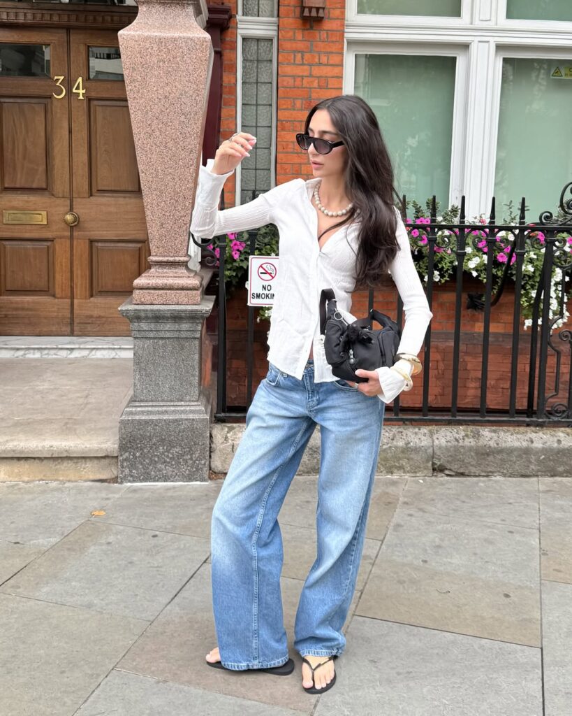 This combination merges refined craftsmanship with relaxed streetwear comfort. The structured linen blouse brings clean elegance and breathable ease, while the indigo denim adds practicality and timeless appeal. This outfit works beautifully for warm afternoons, casual office days, or weekend adventures. The interplay between tailored lines and soft denim creates a balanced look that feels easygoing yet polished.