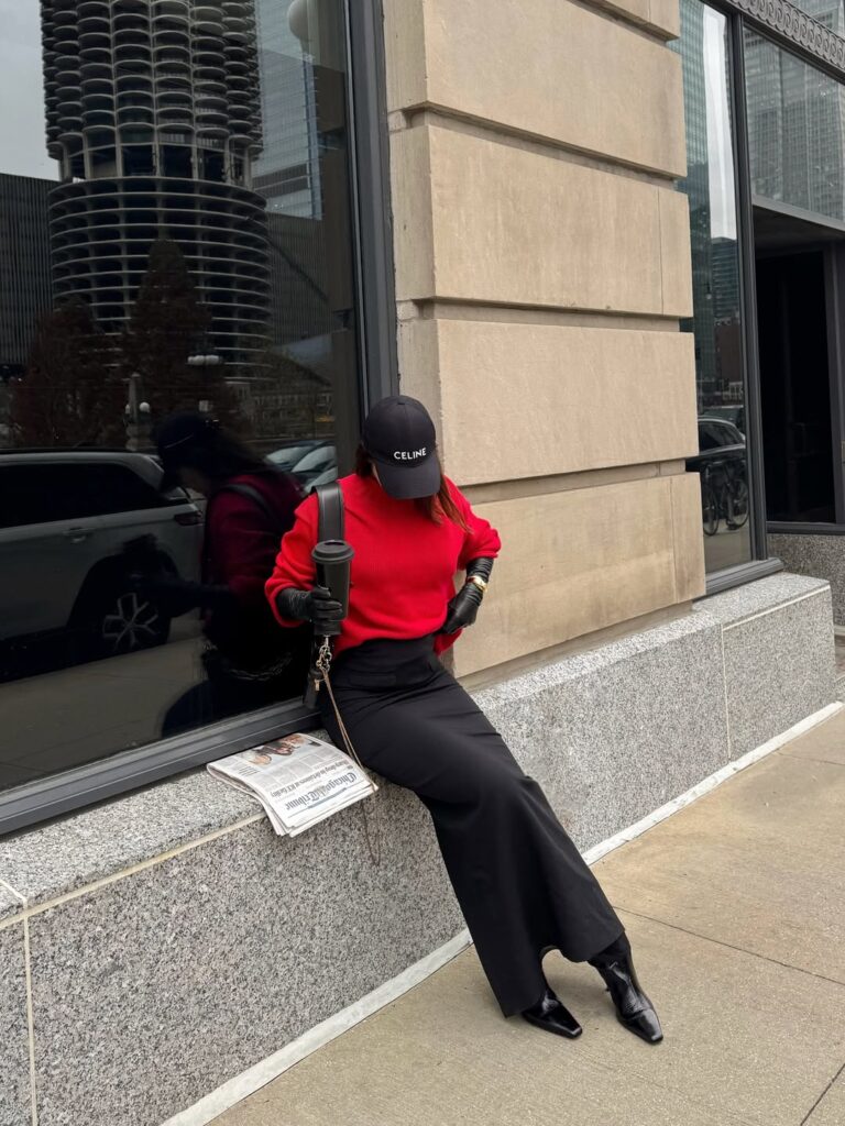 This combination blends cozy knitwear with sleek minimalism. The crimson sweater adds warmth and color, while the noir column skirt creates a refined, elongated silhouette. This look transitions effortlessly from daytime to evening, making it ideal for dinner plans or creative workplace environments. It marries comfort with sophistication, demonstrating how streetwear can embrace softer, more polished elements without losing its modern edge.