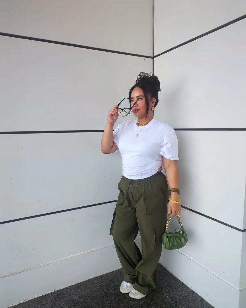 A sculpted white tee paired with olive cargo trousers offers a minimalist yet street-forward appeal. The structured tee brings clean lines and a flattering fit, while the cargo pants add practical pockets and utilitarian charm. This outfit works well for everyday errands, outdoor meetups, or casual workspaces where comfort and style need to coexist. The contrasting shapes—fitted top and relaxed bottoms—create a balanced silhouette that feels modern, wearable, and distinctly urban.