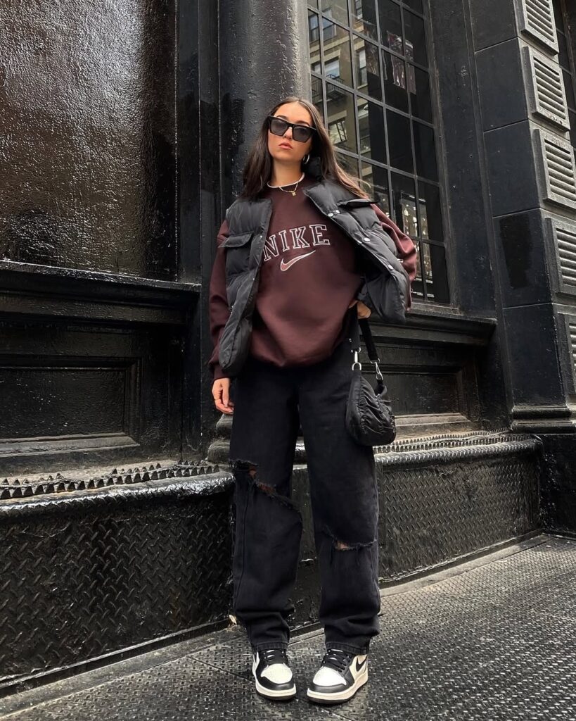 This final look pairs a quilted utility vest with distressed noir denim to create a rugged, layered street aesthetic. The vest adds dimension and practical detailing, while the distressed denim brings in raw, urban character. Perfect for transitional weather or outdoor meetups, the outfit balances texture, warmth, and edge. It’s a great example of how functional pieces can feel fashion-forward when styled intentionally.