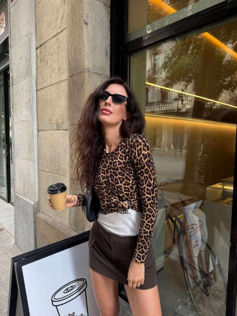 A leopard street tee tucked into a cocoa mini skirt brings together relaxed energy and sleek styling. The tee adds personality, while the mini skirt introduces structure and warmth. Perfect for casual days, café outings, or streetwear-inspired photo moments, this outfit feels playful yet polished. Sneakers or combat boots can shift the mood effortlessly.