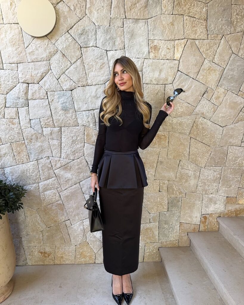 A sleek black peplum skirt paired with a sheer turtleneck offers a sophisticated blend of structure and softness. The peplum adds waist definition, while the sheer material gives the look a subtle, modern allure. Perfect for dinner dates, art events, or chic evenings, this ensemble balances fluidity and polish with ease. Pair it with pointed heels or ankle boots to complete the refined silhouette.