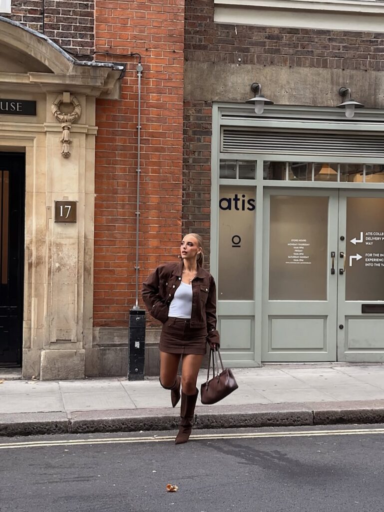 A chestnut denim co-ord paired with a classic white tank strikes the perfect balance between warmth and simplicity. The colored denim adds depth and personality, while the white tank ensures a clean, timeless contrast. Ideal for weekends, errands, or relaxed meet-ups, this outfit feels both structured and comfortable. Sneakers or chunky boots enhance the effortless appeal.