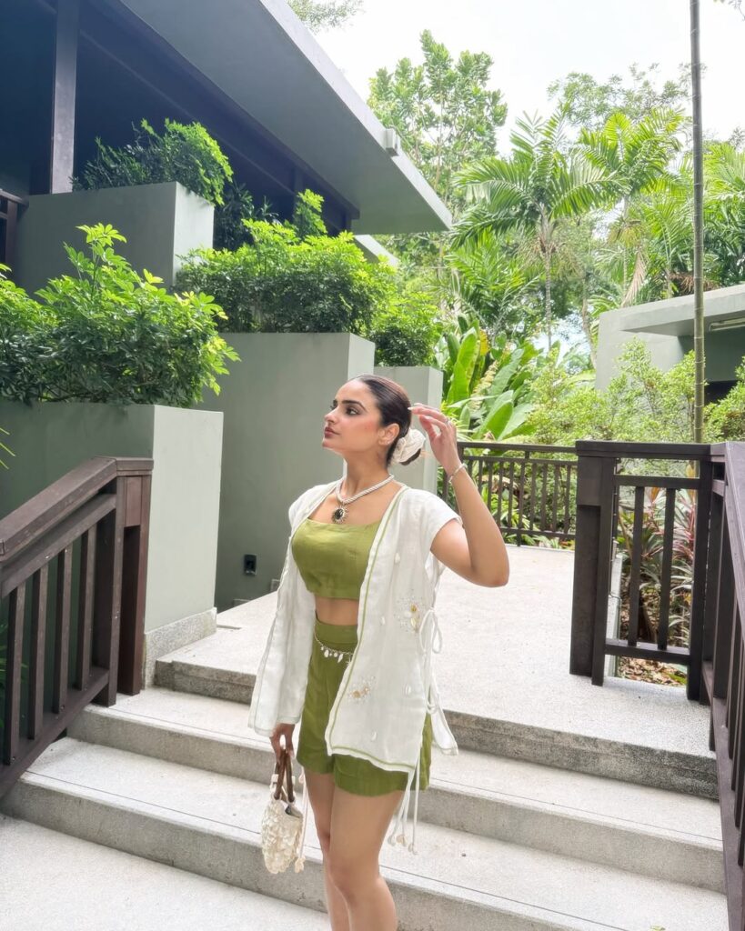 An olive linen co-ord becomes instantly refined with a sheer embroidered overlay. The linen offers structure and breathability, while the overlay introduces delicate, feminine detailing. Great for daytime events, creative workspaces, or relaxed celebrations, this look combines earthy simplicity with ethereal charm. Neutral sandals or block heels keep the ensemble cohesive and refined.