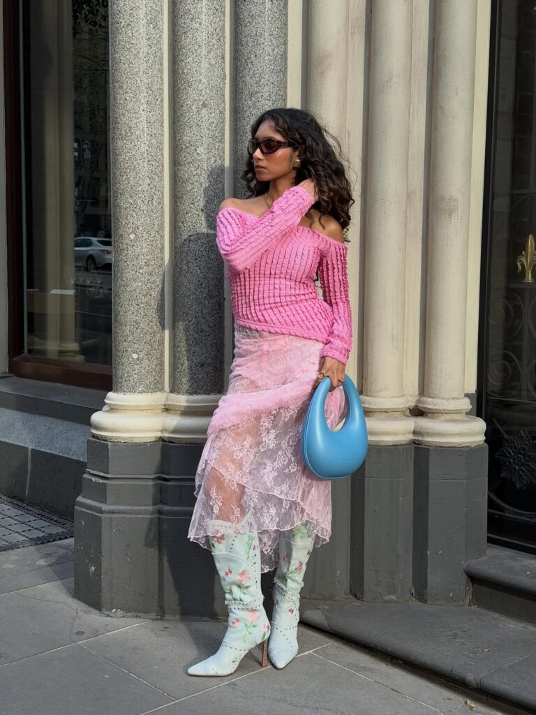 This playful yet romantic look combines a blush lace midi skirt, a candy-pink knit, and floral boots. The lace brings delicacy, the knit adds comfort, and the boots tie in whimsy for a charming, expressive outfit. Perfect for spring days, creative spaces, or cozy weekend outings, this ensemble blends sweetness with style. Its pastel palette creates an uplifting, dreamy mood.