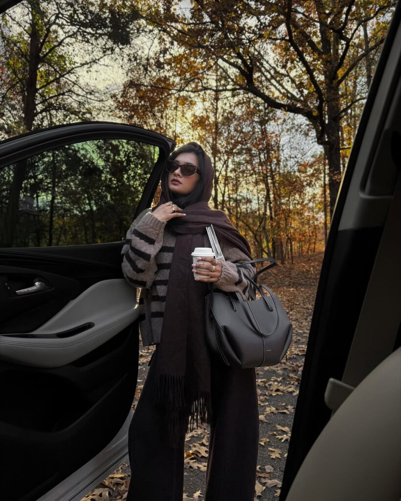 A mocha striped knit layered with an espresso wool scarf delivers cozy texture and rich seasonal tones. The knit adds visual interest through its stripes, while the scarf deepens the palette for a warm, grounded effect. Perfect for coffee shop visits, casual outings, or chilly afternoons, this outfit blends comfort with quiet refinement. Pair it with straight-leg denim or tailored trousers for a polished finish.