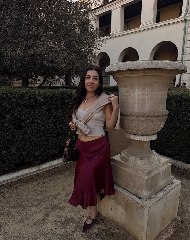 A burgundy satin midi skirt paired with a ribbed knit crop creates a striking interplay of shine and texture. The satin flows beautifully, while the knit crop introduces structure and modern edge. Ideal for evenings out, festive gatherings, or chic celebrations, this look blends elegance with youthfulness. Heels or sleek boots complete the polished silhouette.