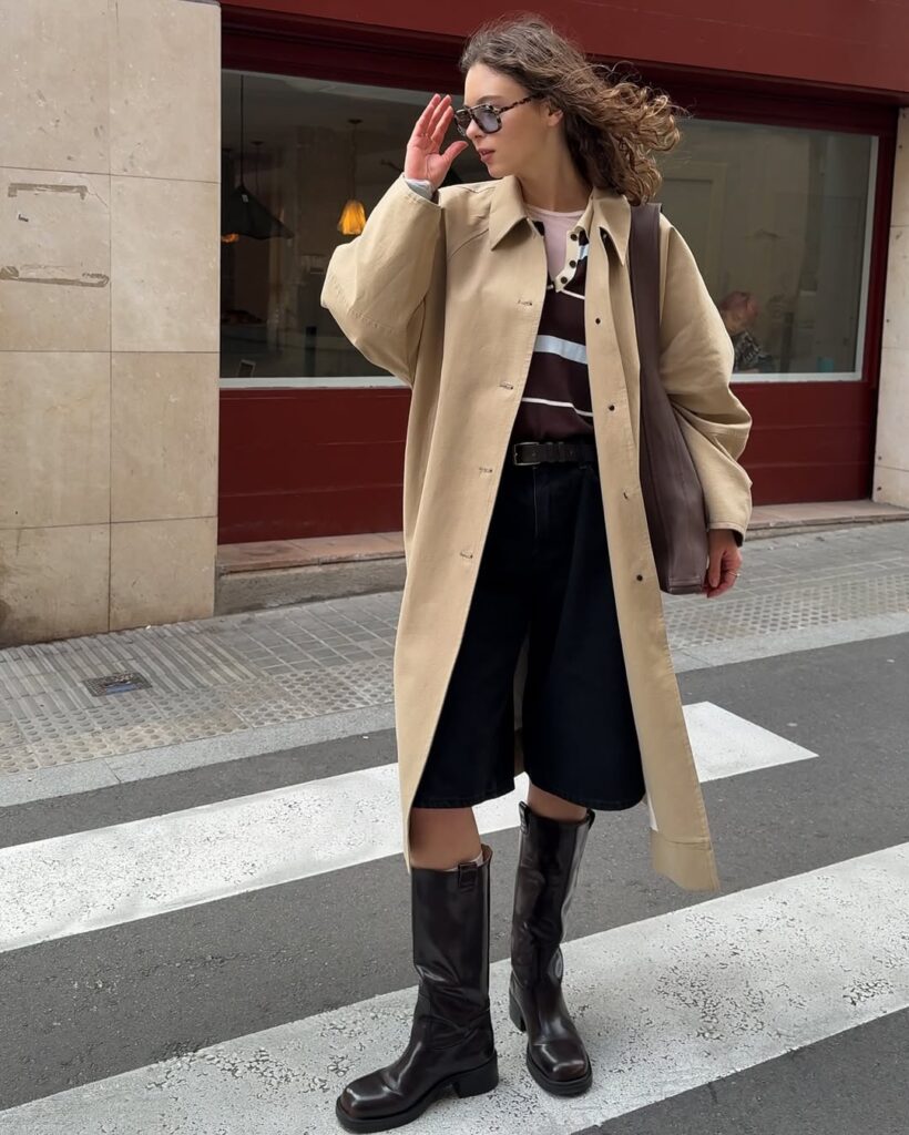 A striped knit polo layered beneath an oversized trench and paired with riding boots creates a refined, equestrian-inspired ensemble. The trench adds movement, the polo introduces pattern, and the boots ground the look with classic structure. Ideal for transitional weather, polished outings, or city walks, this outfit blends comfort with timeless sophistication.