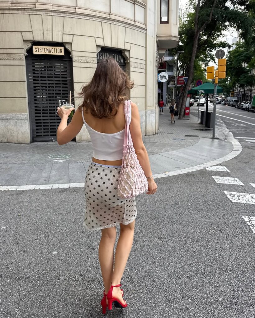 An embroidered mesh skirt paired with a sleek white crop top creates a romantic yet modern aesthetic. The skirt’s delicate details and movement offer texture, while the crop top brings clean simplicity. Ideal for warm-weather evenings, date nights, or artistic gatherings, this look balances breathability and high style. Neutral heels or sandals maintain its graceful appeal.