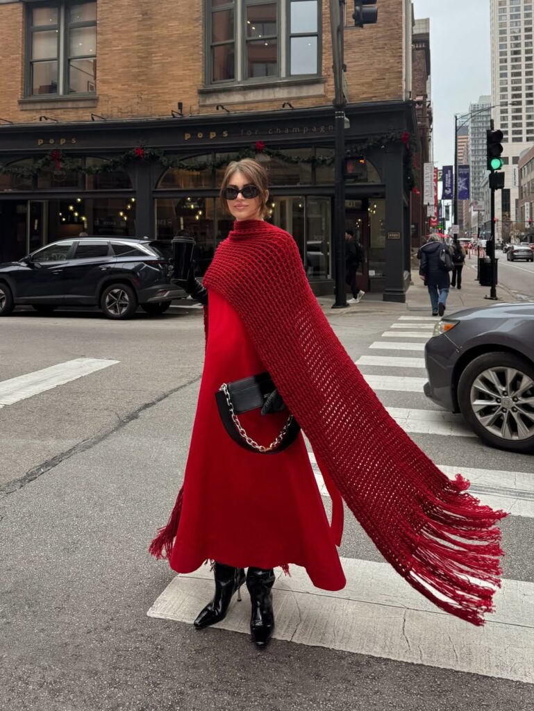 A crimson fringe cape layered over a sleek midi dress creates an unforgettable combination rich in color and movement. The fringe adds dramatic flair, while the midi dress offers clean lines for balance. Perfect for evening gatherings, holiday dinners, or standout events, this outfit blends boldness with timeless elegance. Minimal jewelry lets the cape remain the focal point.