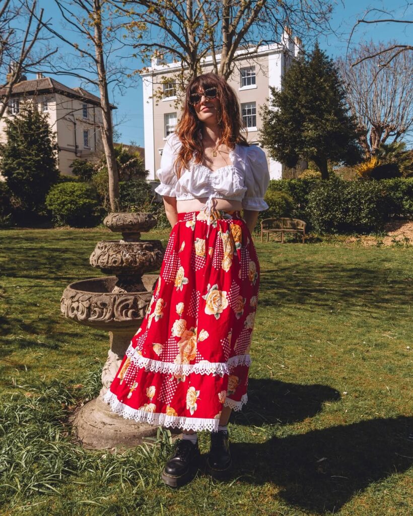 This outfit is vibrant, romantic, and full of vintage personality. The puff-sleeve peasant blouse brings softness and texture, while the scarlet floral tiered skirt adds movement and striking color. The combination feels perfect for spring festivals, garden parties, or warm afternoon outings. The airy blouse balances the boldness of the skirt, creating a look that feels both expressive and wearable. With light, breathable fabrics, the outfit offers comfort while still making an unforgettable impression.