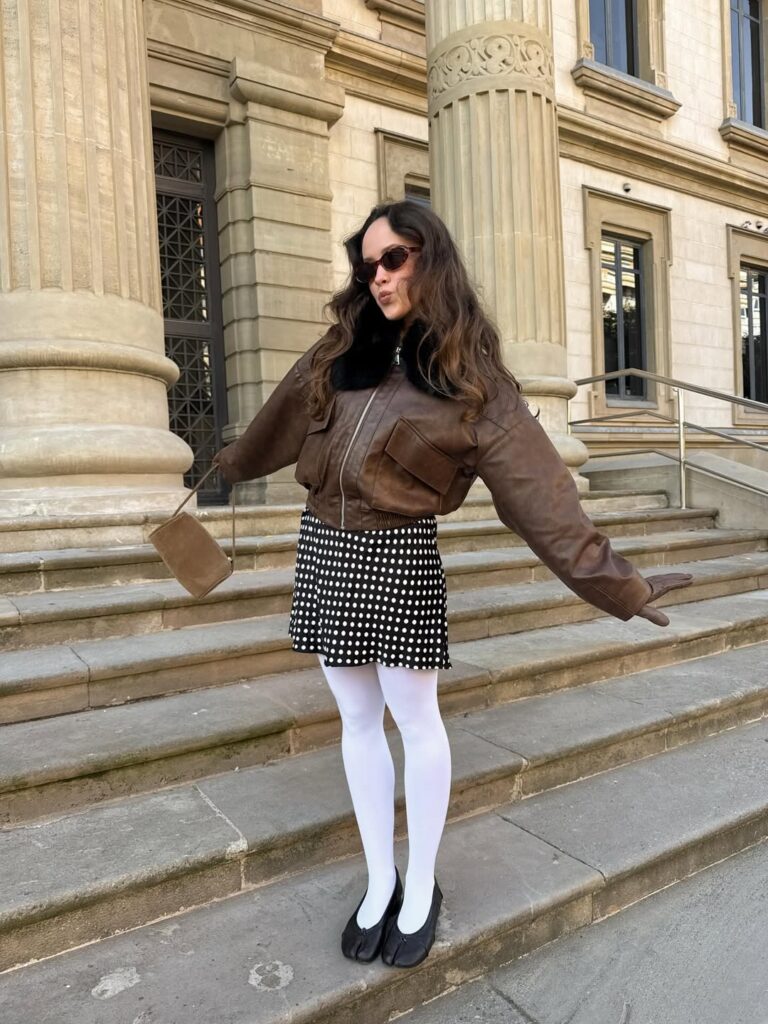 A vintage aviator jacket paired with a polka-dot mini skirt combines rugged heritage style with a touch of playful femininity. The aviator jacket adds warmth, edge, and structure, while the mini skirt brings a whimsical retro charm. Perfect for transitional seasons, this look works well for casual outings, weekend adventures, or relaxed daytime events. The contrast of textures—leather against soft fabric—creates visual interest while keeping the outfit comfortable and versatile.