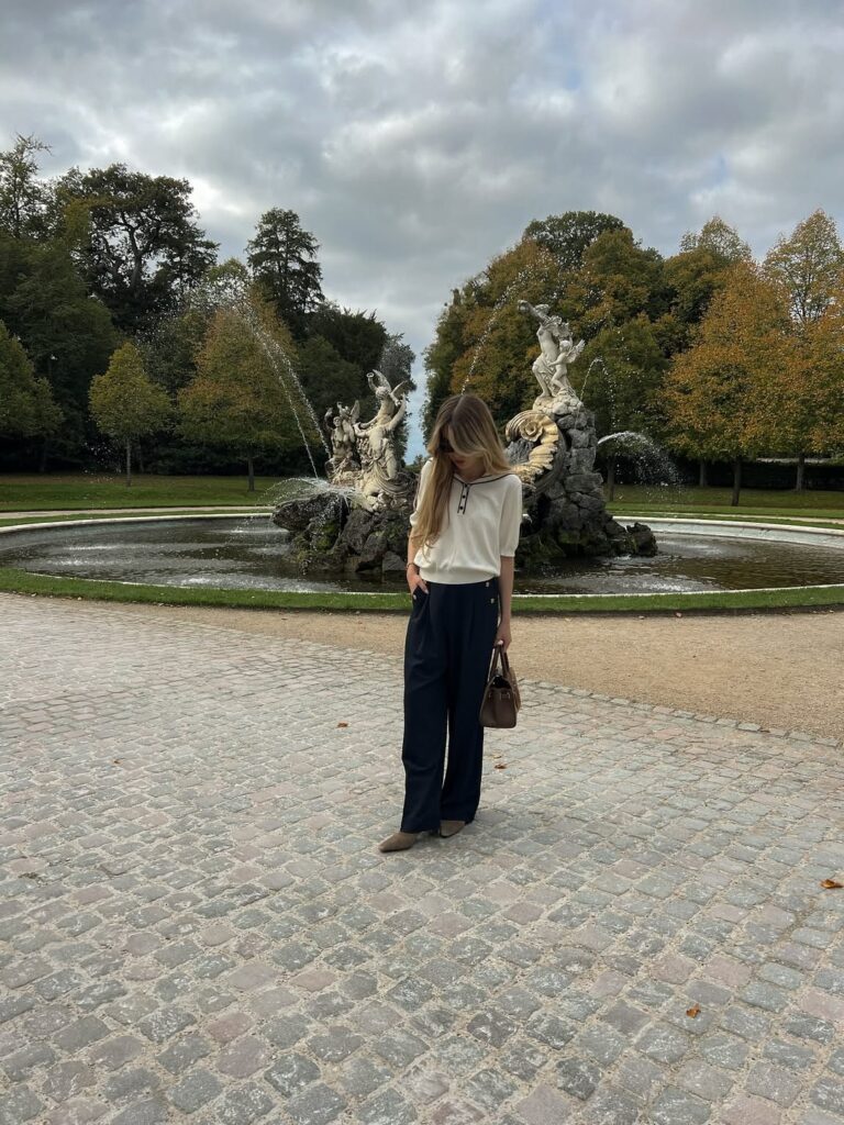 This combination evokes a relaxed yet sophisticated vintage charm. The cream Henley knit adds texture and a slightly rustic feel, while the navy tailored trousers elevate the overall look with classic precision. It’s an outfit suited for casual office days, bookstore visits, or cozy weekend outings. The balance between structured trousers and a soft knit ensures comfort while maintaining visual polish. The contrast between cream and navy also creates a timeless, effortless harmony reminiscent of nautical vintage aesthetics.