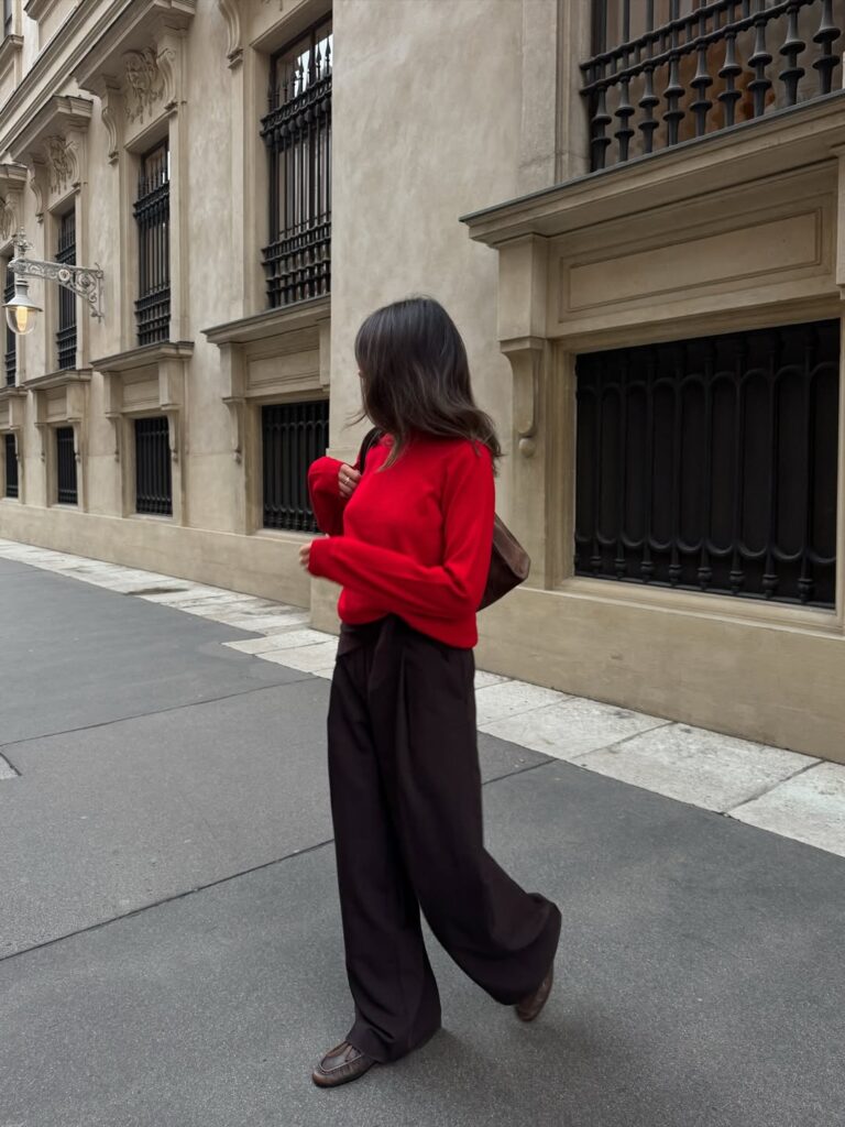 The combination of a crimson knit sweater and espresso wide-leg trousers is rich, warm, and deeply vintage in tone. The crimson adds vibrancy and charm, while the espresso trousers provide depth and grounding. Together, they create a sophisticated palette ideal for autumn gatherings, museum days, or casual dinner outings. Wide-leg trousers ensure movement and comfort, while the cozy knit adds texture and approachability. This pairing beautifully blends comfort with refined elegance, making it both wearable and visually striking.