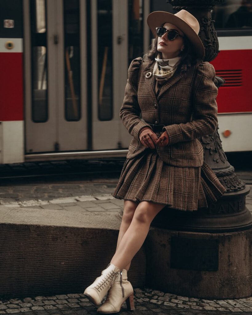 A vintage plaid suit feels bold yet grounded, especially when paired with cream lace-up booties for a softer contrast. The structured blazer and matching trousers create a cohesive silhouette inspired by classic menswear tailoring, while the plaid pattern gives it a scholarly, heritage feel. Cream booties add femininity and warmth, making the outfit perfect for fall outings, creative workplaces, or café study sessions. This look merges nostalgia with contemporary comfort, offering mobility, style, and personality without compromising on refinement.