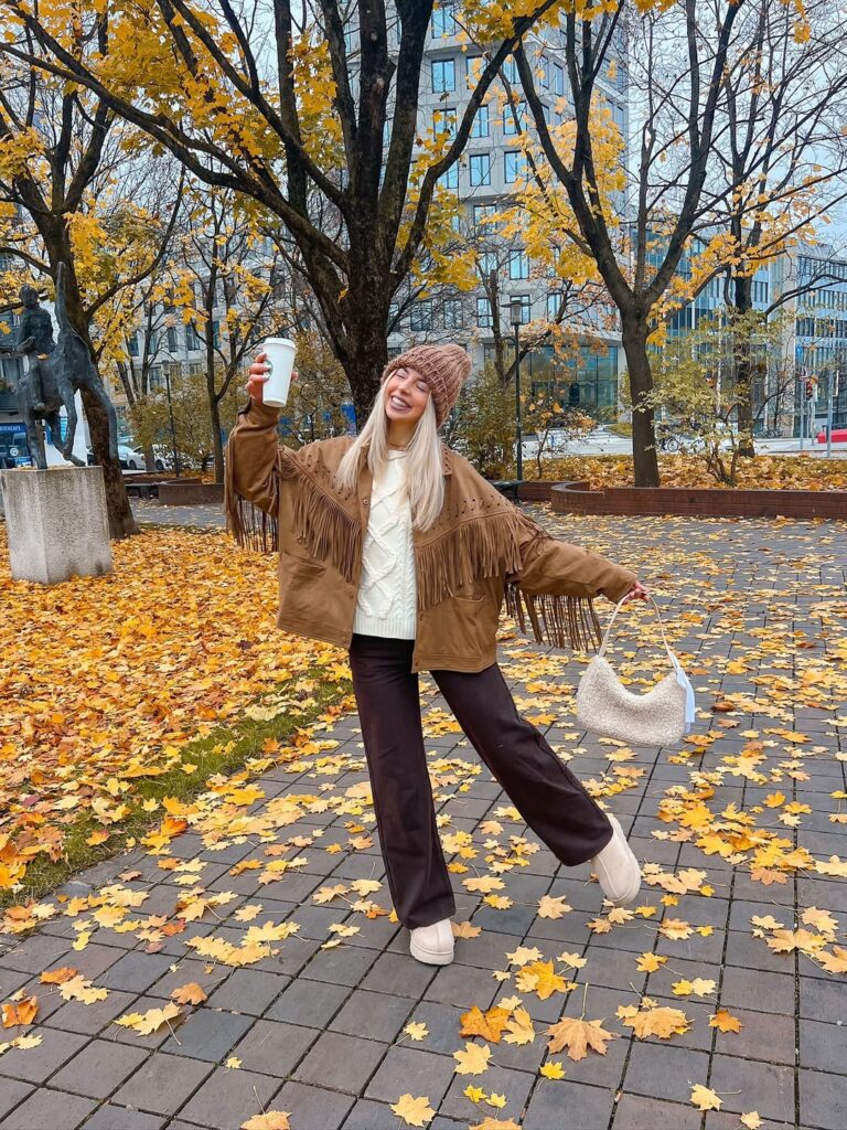16. Fringed Suede Jacket with Cream Knit and Chocolate Trousers