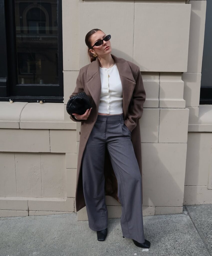 2. Taupe Wool Coat with Tailored Wide-Leg Trousers