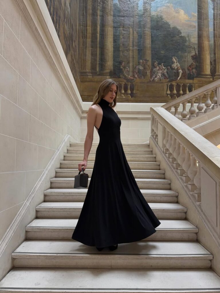 This black halter gown exudes Parisian museum elegance with its sculptural lines and classic sophistication. The halter neckline draws attention to the shoulders and collarbone, creating a timeless silhouette inspired by vintage couture. Ideal for evening galas, art events, or any occasion where you want to evoke graceful drama, the gown offers both comfort and presence through its flowing fabric and minimalist design. Its simplicity allows accessories—pearls, a clutch, or a velvet wrap—to shine without overpowering the look, keeping the outfit both modern and deeply elegant.