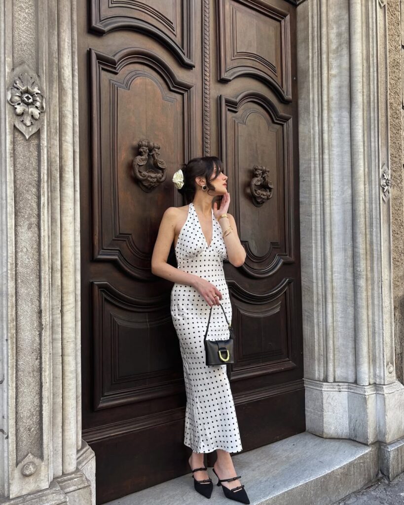 A vintage polka-dot halter dress is the perfect blend of playful femininity and old-Hollywood glamour. The halter neckline highlights the shoulders beautifully, while the polka-dot print adds a retro charm that never goes out of style. Noir accents—whether in the form of a slim belt, classic pumps, or a delicate hair bow—add sophistication and make the outfit feel more polished. This look works effortlessly for summer dates, brunch outings, or even semi-formal events where a touch of nostalgia feels just right. The lightweight silhouette keeps it breathable and comfortable while maintaining a timeless, fashionable edge.
