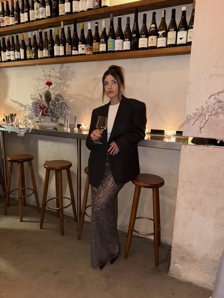 This outfit mixes classic menswear cues with glamorous vintage sparkle. A pinstripe blazer provides structure and sophistication, while the smoky sequin maxi skirt adds movement and a subtle shimmer. The contrast between tailored lines and fluid, embellished fabric creates an elevated evening look perfect for cocktail events or holiday celebrations. Despite its bold combination, the outfit remains balanced and surprisingly comfortable, offering both drama and ease through its mix of textures and silhouettes.