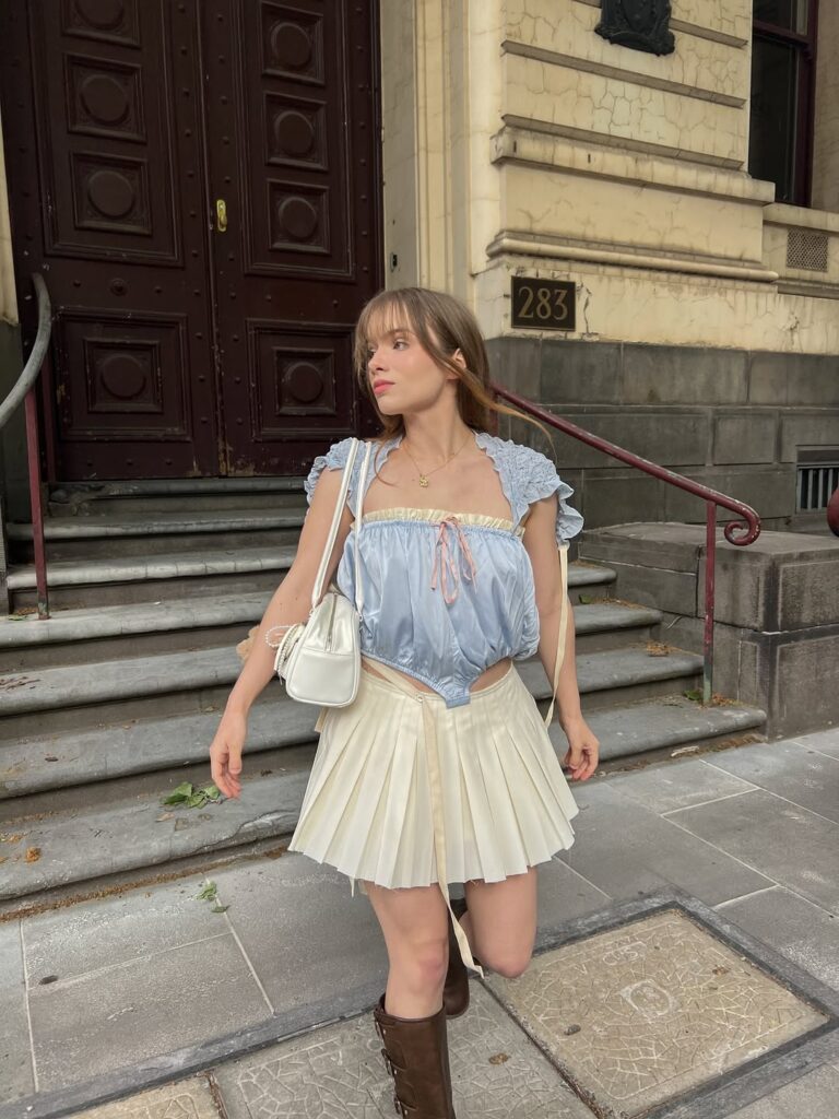 A powder-blue peasant top paired with an ivory pleated mini captures youthful, romantic vintage charm. The peasant top’s soft neckline and gentle gathering evoke countryside nostalgia, while the pleated skirt adds structured femininity. This outfit is perfect for spring picnics, daytime dates, or strolls through botanical gardens. Despite its delicate appearance, it remains comfortable and breezy, offering ease of movement and an airy aesthetic. The mix of soft blue and ivory keeps it light, dreamy, and effortlessly timeless.