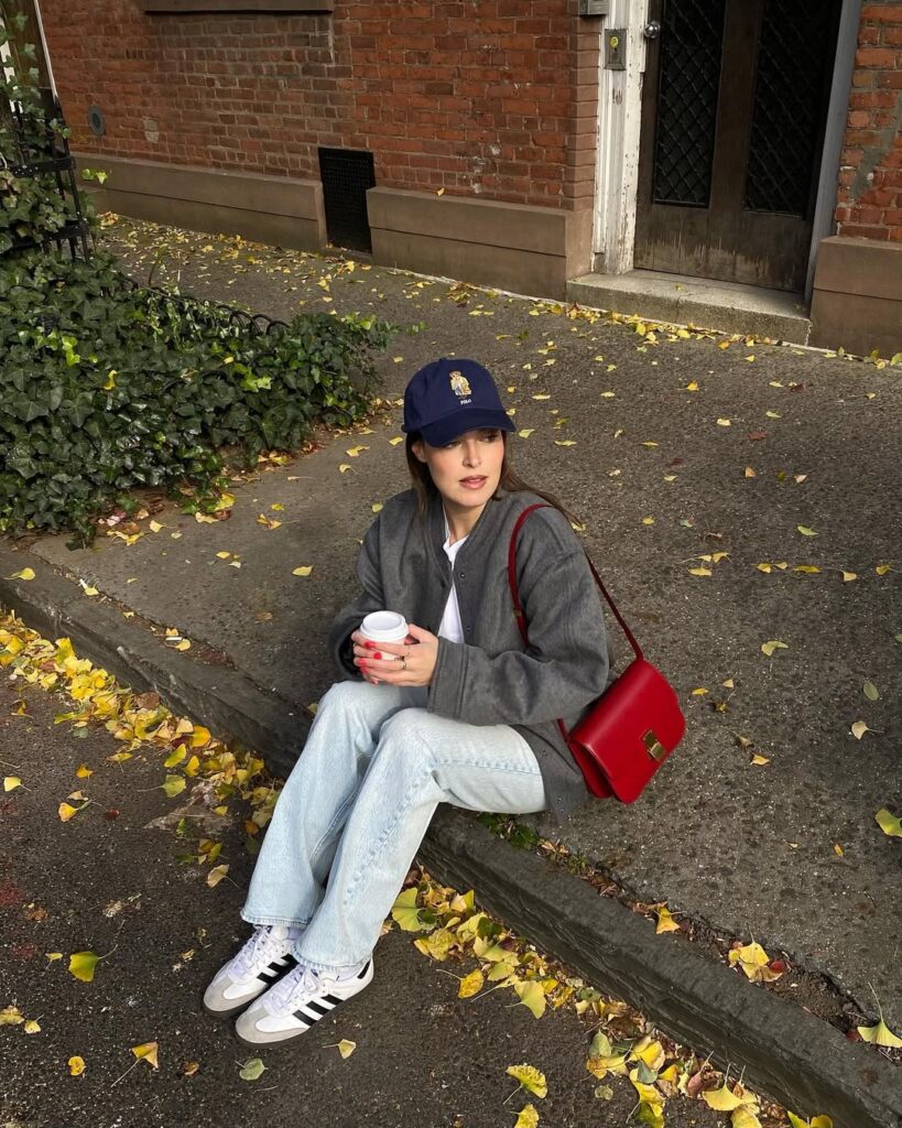 A casual grey bomber jacket layered over vintage denim creates an effortlessly cool look rooted in retro street style. The addition of a red crossbody bag adds a vibrant pop of color that lifts the entire outfit. Perfect for on-the-go days, coffee runs, or casual meetups, this ensemble blends comfort with personality. The bomber adds structure and warmth, while vintage denim keeps the look grounded and familiar. It’s a simple yet stylish option for everyday fashion with a nostalgic twist.