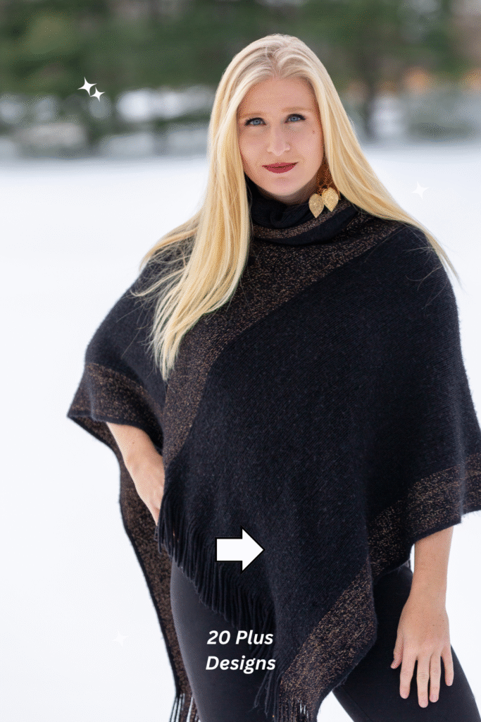 This outfit features a luxurious midnight-hued knit poncho adorned with delicate metallic trim, making it an instant statement piece. The oversized design drapes effortlessly, providing warmth while allowing freedom of movement. Paired with tailored trousers or sleek leggings, it transforms casual winter dressing into a stylish, polished ensemble. Ideal for evening strolls, coffee dates, or casual winter gatherings, the metallic accents add a subtle sparkle that elevates the look. Combining softness with shimmer, it perfectly balances comfort with sophistication, making you feel chic and cozy simultaneously.