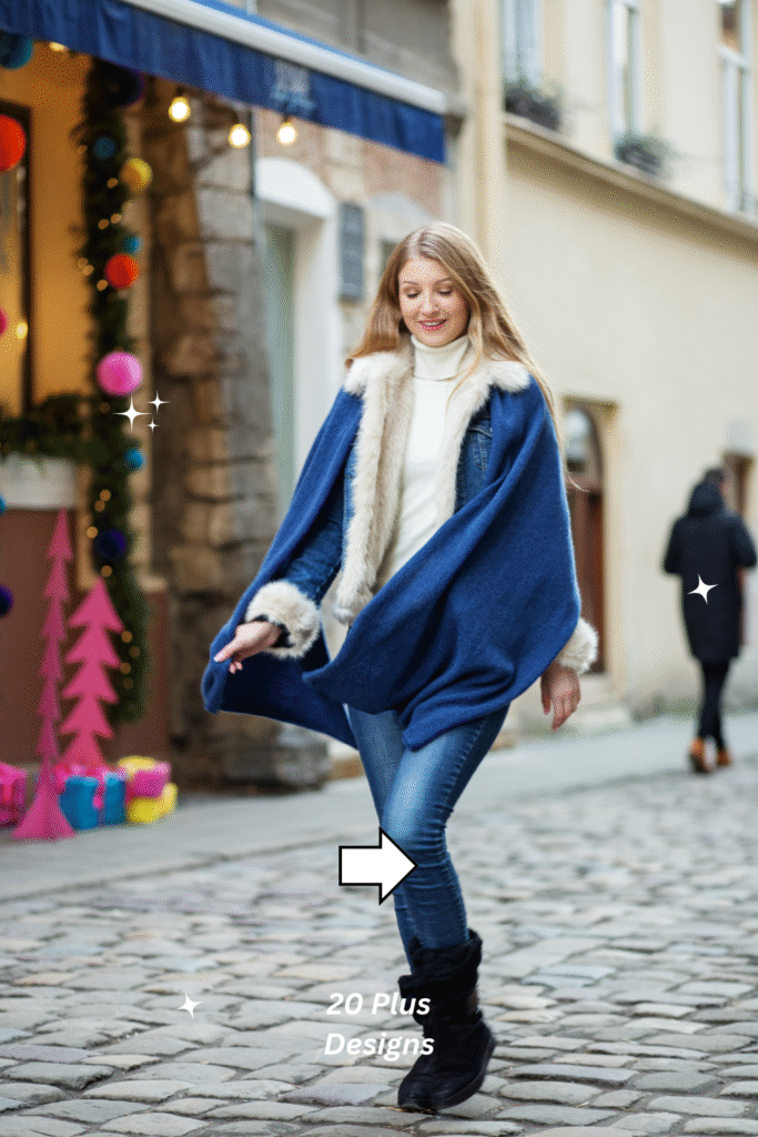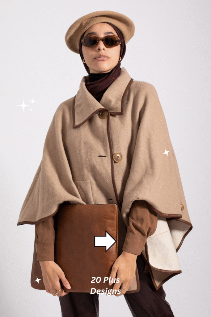 A camel wool cape accented with rich chocolate trim is a classic winter look elevated with thoughtful details. The matching beret adds Parisian flair, making this outfit perfect for city sightseeing, winter markets, or cultural outings. The cape’s generous cut allows for layering while maintaining structure, and the wool fabric offers warmth without bulk. The color contrast between camel and chocolate adds sophistication, ensuring the outfit looks polished and intentional. This ensemble demonstrates how a few well-chosen accessories can transform a simple cape into a stylish winter statement.