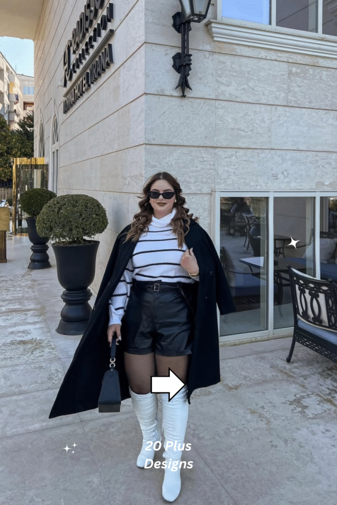 This outfit brings unexpected edge to winter layering, pairing a cozy striped turtleneck with sleek leather shorts and crisp white boots. The turtleneck provides warmth, while the shorts and boots combination creates a playful yet sophisticated contrast. Ideal for indoor events, brunches, or fashion-forward gatherings, it balances comfort with trendiness effortlessly. The stripes add visual interest, and the leather element ensures a contemporary, polished vibe. This look proves that winter style doesn’t always mean heavy layers—it’s about smartly mixing textures and proportions to stay stylish and comfortable.