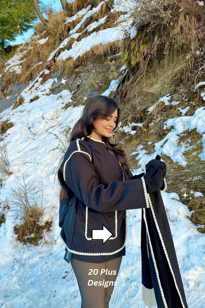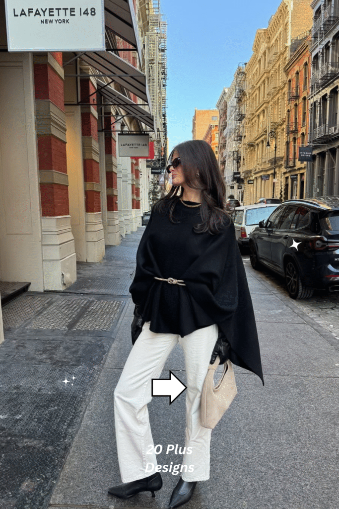 A black belted cape paired with ivory trousers exudes modern elegance and timeless winter chic. The cape’s drape is flattering, cinched at the waist for definition, while the pointed boots elongate the legs and elevate the silhouette. Ideal for professional settings, evening events, or stylish daytime outings, this outfit effortlessly merges sophistication with practicality. Its monochrome palette ensures versatility, while the belted design maintains structure. This ensemble highlights how winter dressing can be both comfortable and polished without compromising on contemporary style.