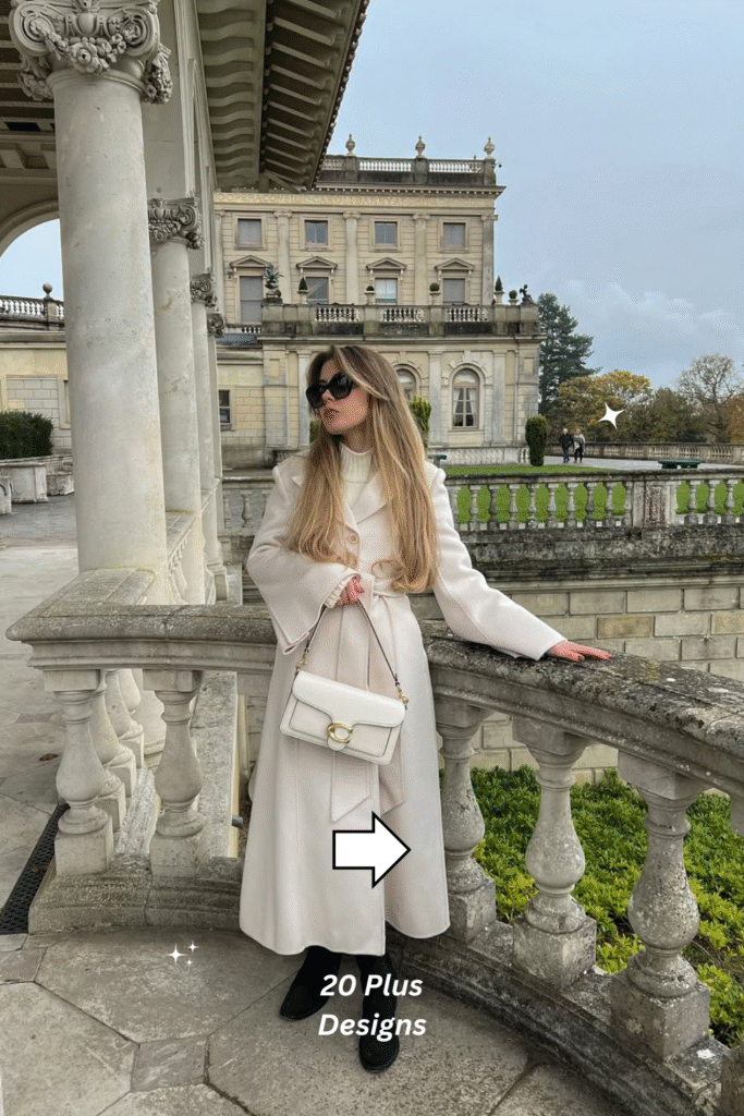This ivory wool coat epitomizes understated luxury, complemented by a structured handbag and elegant suede boots. Its tailored fit provides a sleek profile while the soft wool ensures warmth in colder temperatures. Perfect for office commutes, winter shopping trips, or daytime gatherings, the neutral palette allows for effortless pairing with colorful or patterned accessories. The structured handbag adds sophistication, while the suede boots contribute a textural element. This outfit demonstrates how simple, quality pieces can combine to create a refined, cozy, and stylish winter look.