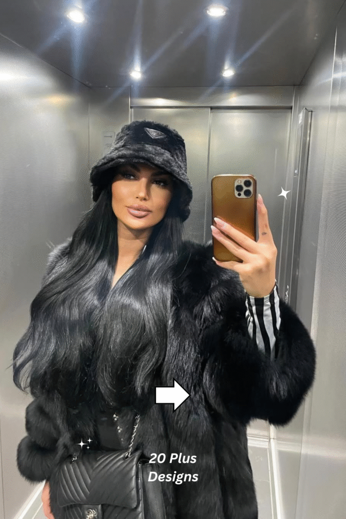 14. Black Faux Fur Coat with Quilted Bag and Plush Bucket Hat