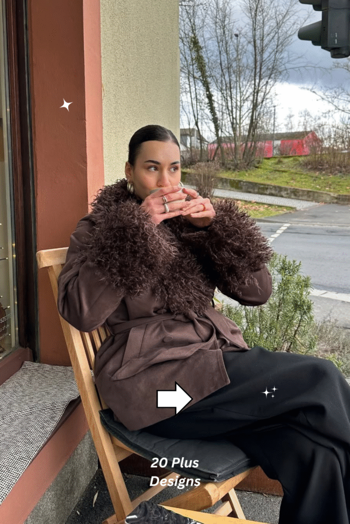 This chocolate shearling coat, paired with wide-leg trousers, merges comfort with a sophisticated silhouette. The coat’s plush interior ensures warmth, while its tailored exterior maintains a polished look. Wide-leg trousers add movement and ease, making the outfit perfect for long winter days, city commutes, or casual meetings. The monochromatic chocolate palette creates a harmonious, luxurious effect, while the combination of textures keeps the outfit visually dynamic. It’s a look that proves functional winter clothing can still feel elegant, structured, and effortlessly stylish.