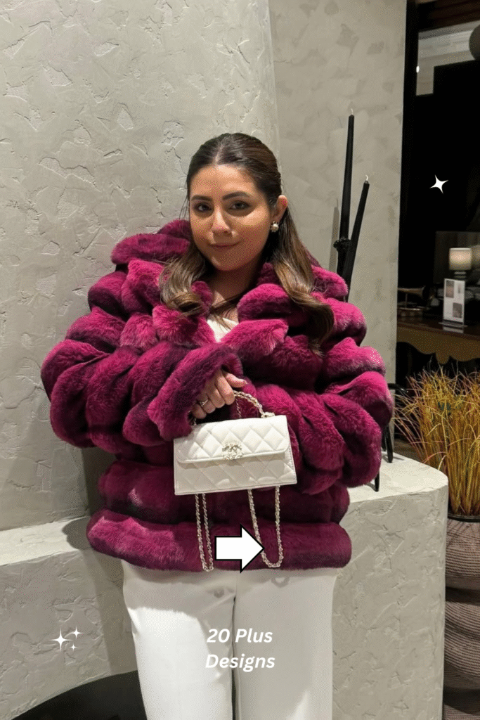 A rich plum faux fur coat paired with a quilted mini bag exudes playful sophistication. The plush coat offers warmth while its vibrant color adds a standout touch to muted winter palettes. Perfect for social gatherings, evening events, or city outings, the coat provides both comfort and style. The mini bag introduces textural contrast and a modern accessory element. This look demonstrates how bold color and carefully selected textures can create a winter outfit that is both practical and fashion-forward.