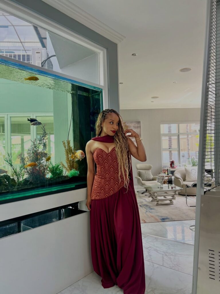 This bold crimson gown commands attention with its dramatic draping and gold embellishments. Perfect for grand evening affairs, it radiates confidence and allure while maintaining classic sophistication.