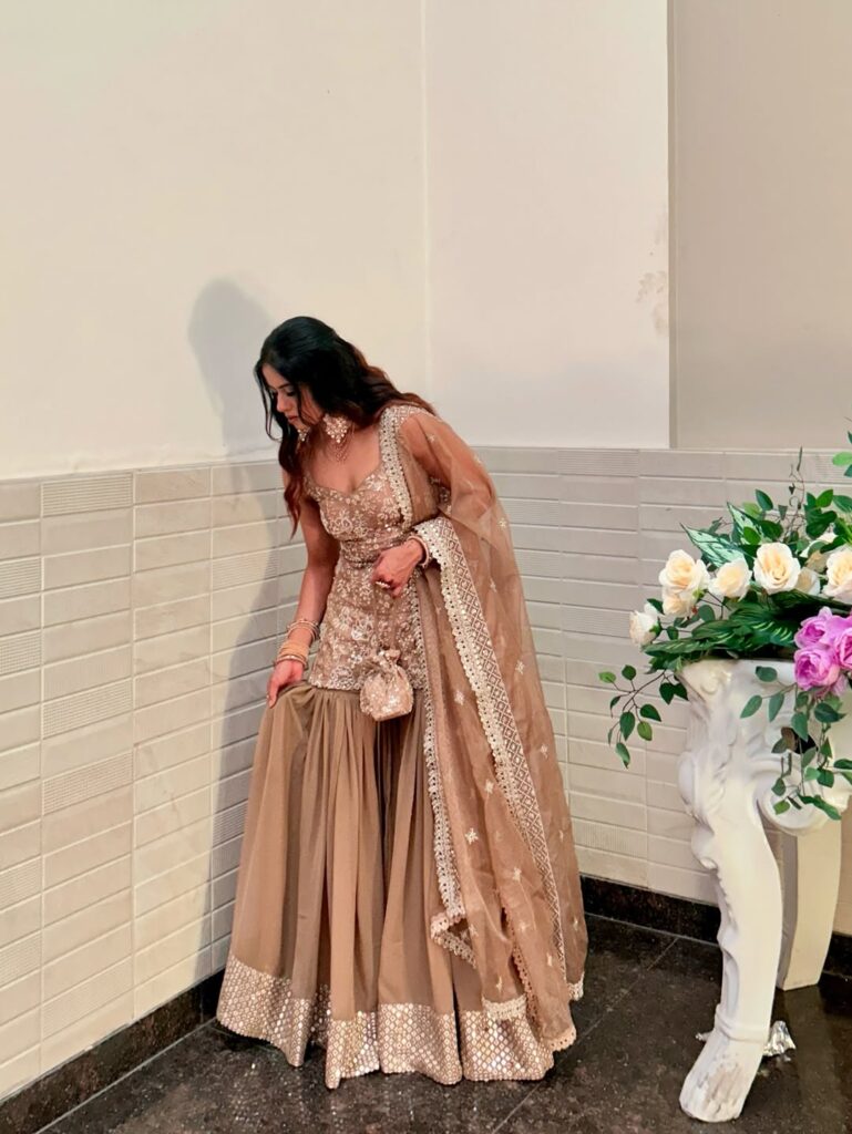 16. Champagne Embroidered Lehenga with Sheer Net Dupatta