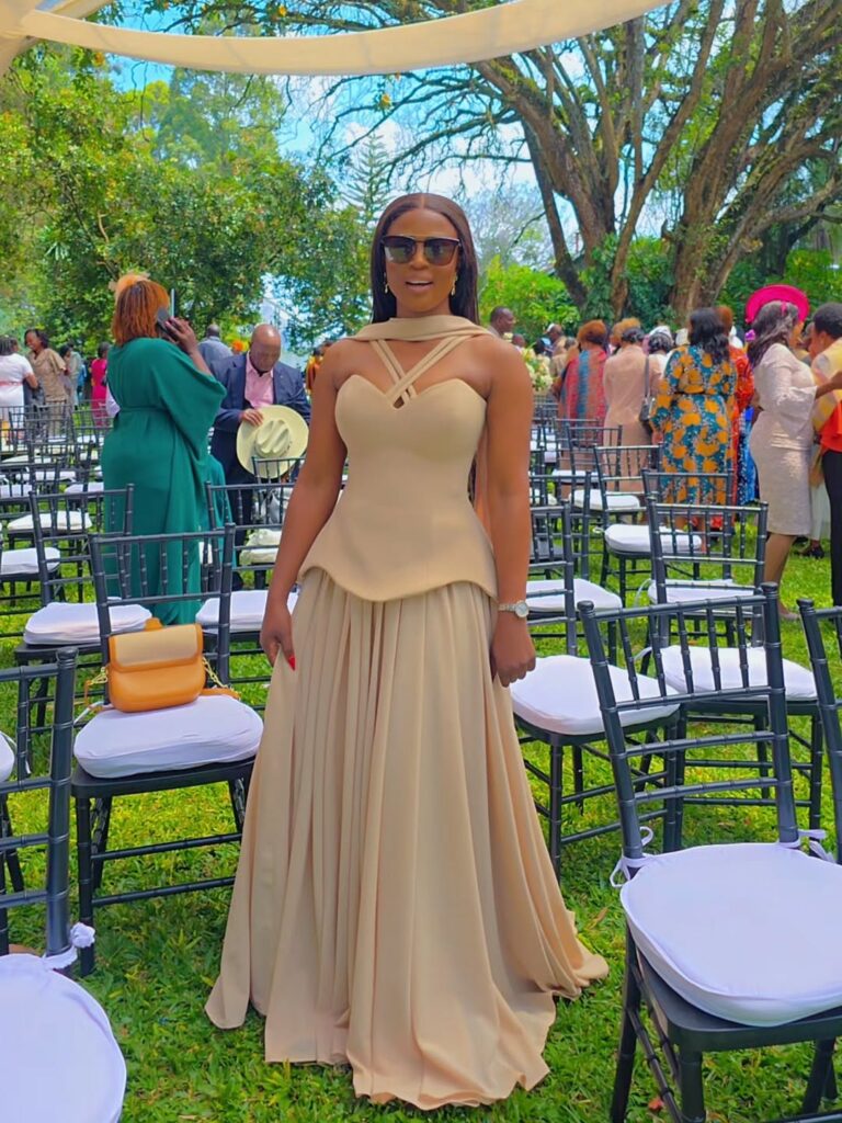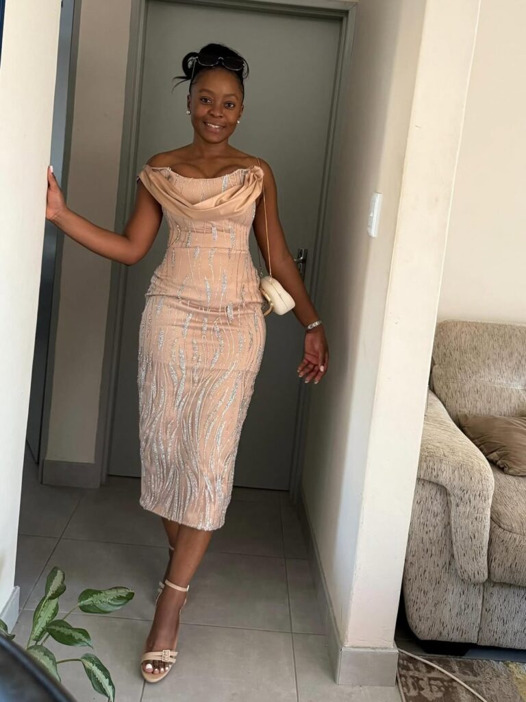 This sequin midi dress brings sparkle to any celebration. The champagne tones shimmer subtly, and the draped neckline adds sophistication to its bold charm. It’s the perfect choice for evening receptions where elegance meets festive energy.