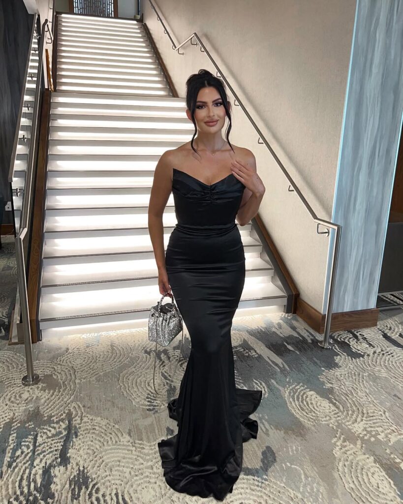 Chic and refined, this midnight satin gown flows gracefully with every movement. The ruched bodice enhances the silhouette, creating a flattering hourglass effect. Ideal for formal weddings, this gown captures the drama and grace that define an unforgettable night.